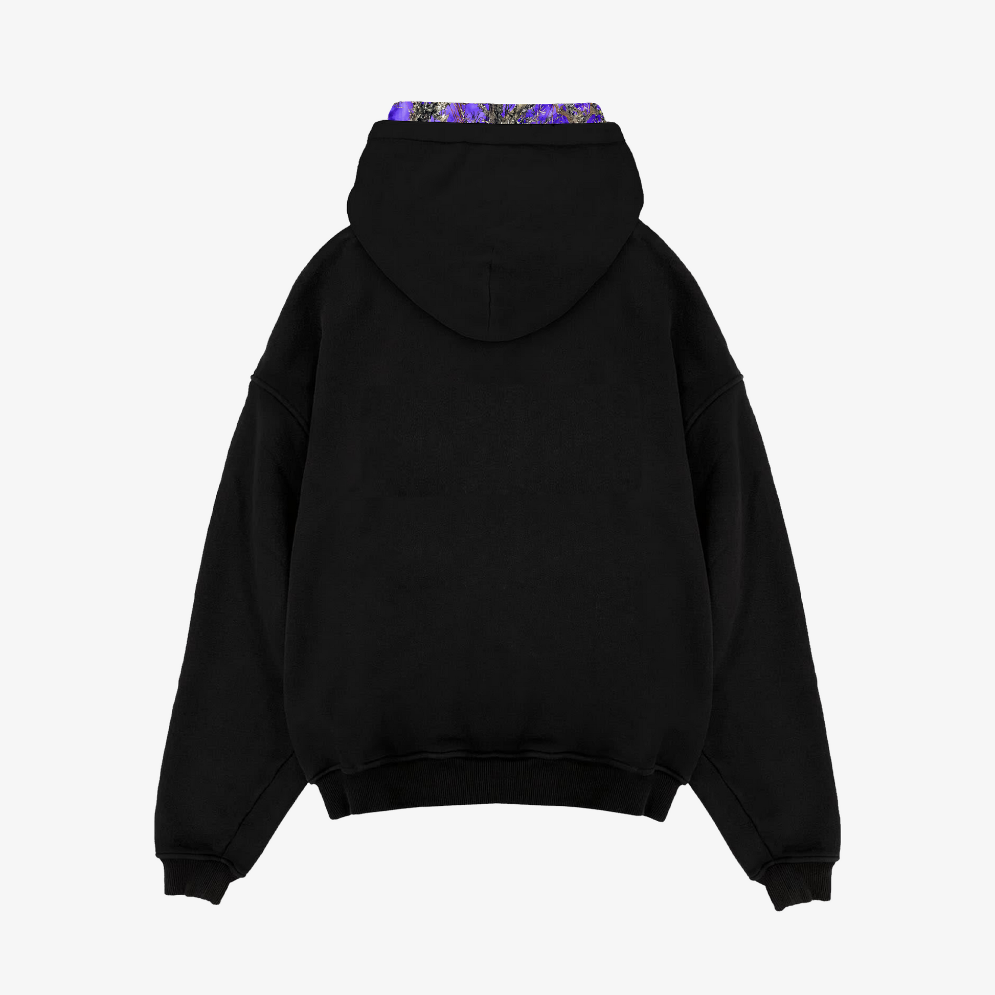 Handcrafted from 100% natural French terry cotton, this heavyweight suit redefines comfort with durability and structure. The innovative double-hood and double-waistband design create a layered, sculpted silhouette. Finished with a bold purple camo print on the inner hood and upper waistband, it balances refinement with edge. Zippered pockets provide function without compromising the clean profile.